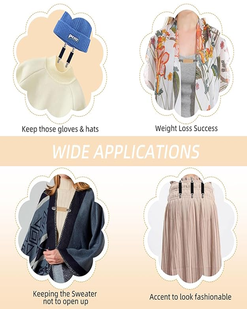 Bu giysi sıkıştırma klipsleri 7 renk seçeneğiyle sunulur farklı kıyafetlerle uyumludur. Elbiseler, şallar ve kot pantolonlar için idealdir, pantolon bel sıkıştırma klipsi veya pantolon bel sıkıştırma klipsi olarakta kullanılabilir .